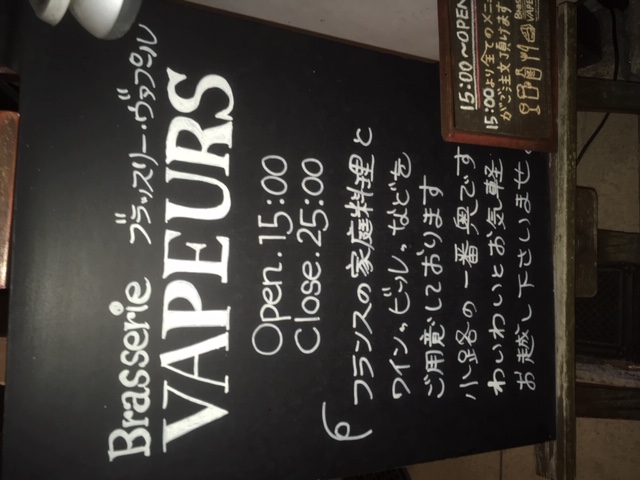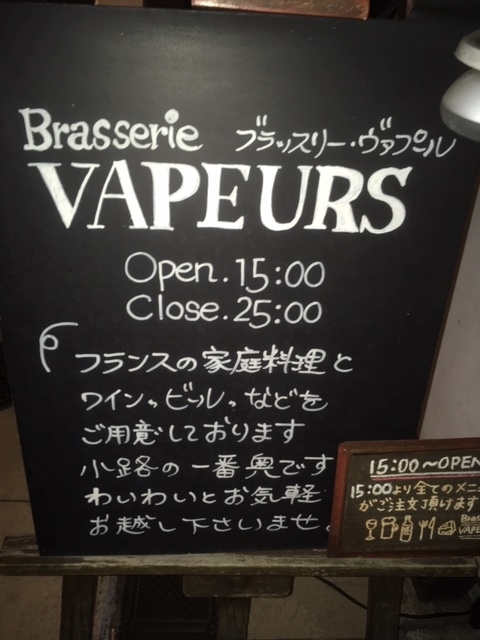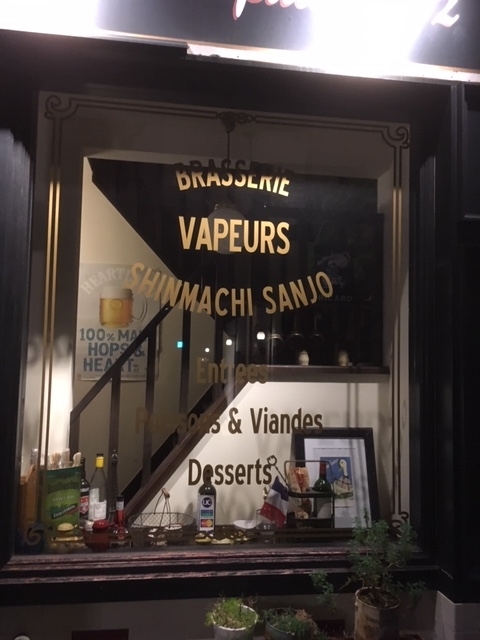 打ち合わせ終了後、夜遅くクライアントとふらっと行ったのが滞在先のホテルからほど近い、フランス家庭料理のお店「Brasserie VAPEURS 三条新町ブラッスリーヴァプール サンジョウシンマチ」(25時まで営業)。