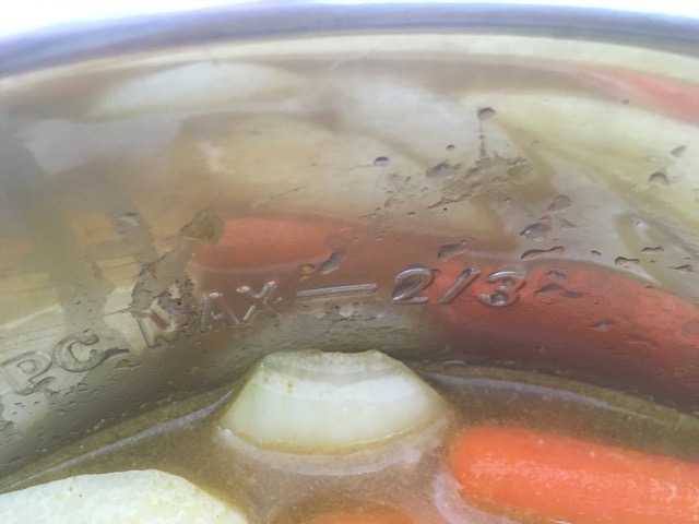 最後にじゃがいもを足して、水を1000ml加えます。バーモントカレーの箱には水は1400ml と書かれていますが、インスタントポットは水分が良い塩梅に蒸発しないので、1400ml では水っぽいシャバシャバカレーになります。