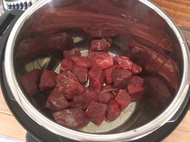 まずは、インスタントポッドをソテーモードにして塩胡椒をまぶしたビーフを軽く炒めます。