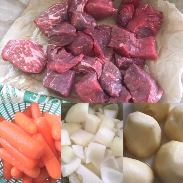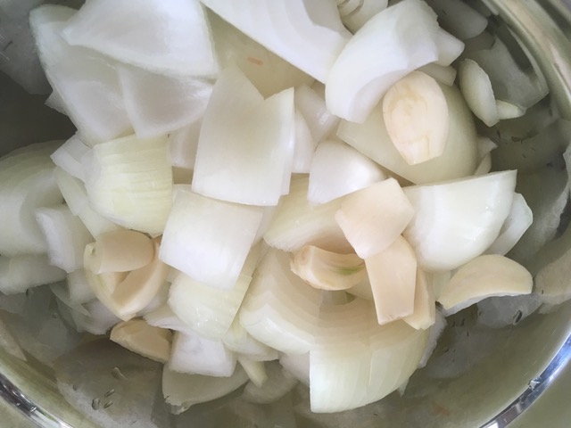 下ごしらえは超テキトー。ビーフは切らずにそのまま。玉ねぎざく切り。にんにく半切り。